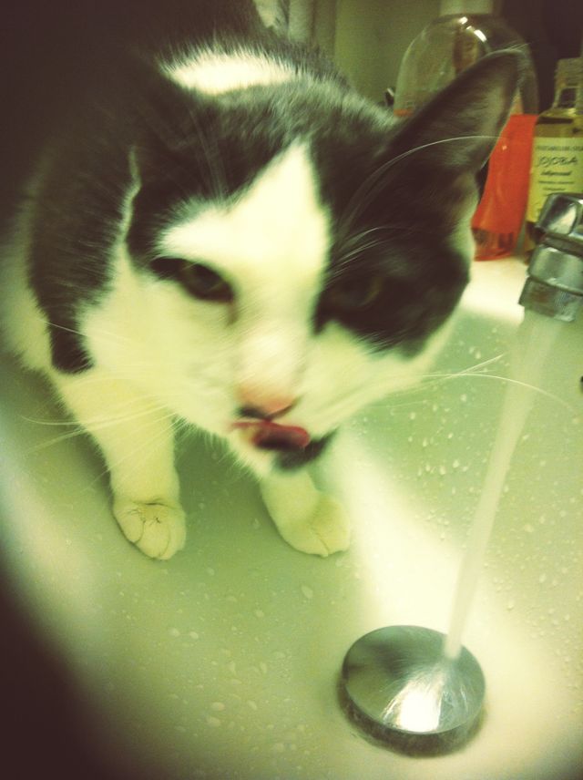 Viktor started a new habit of drinking from the tap in the bathroom here on the second floor. Even though he has a water bowl… Oh well, when I see him jump up to the tap I turn it on. He should have one of those “water bowl fountains” that I saw at the cat cafés in Seoul – smart!