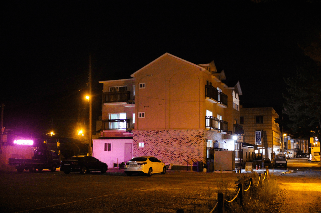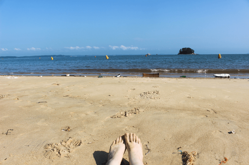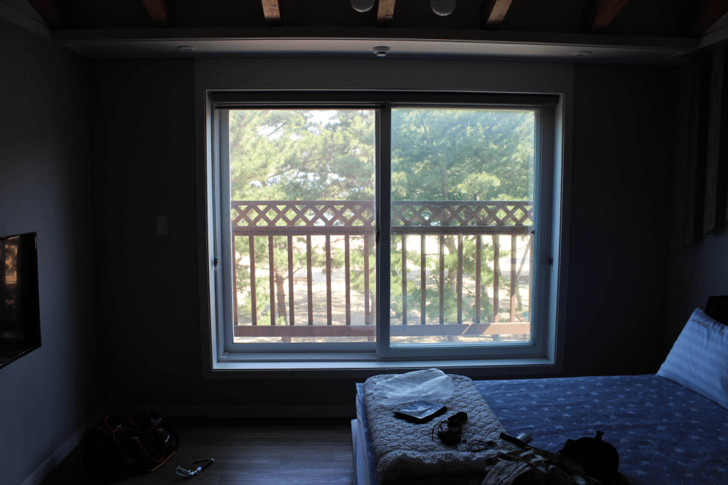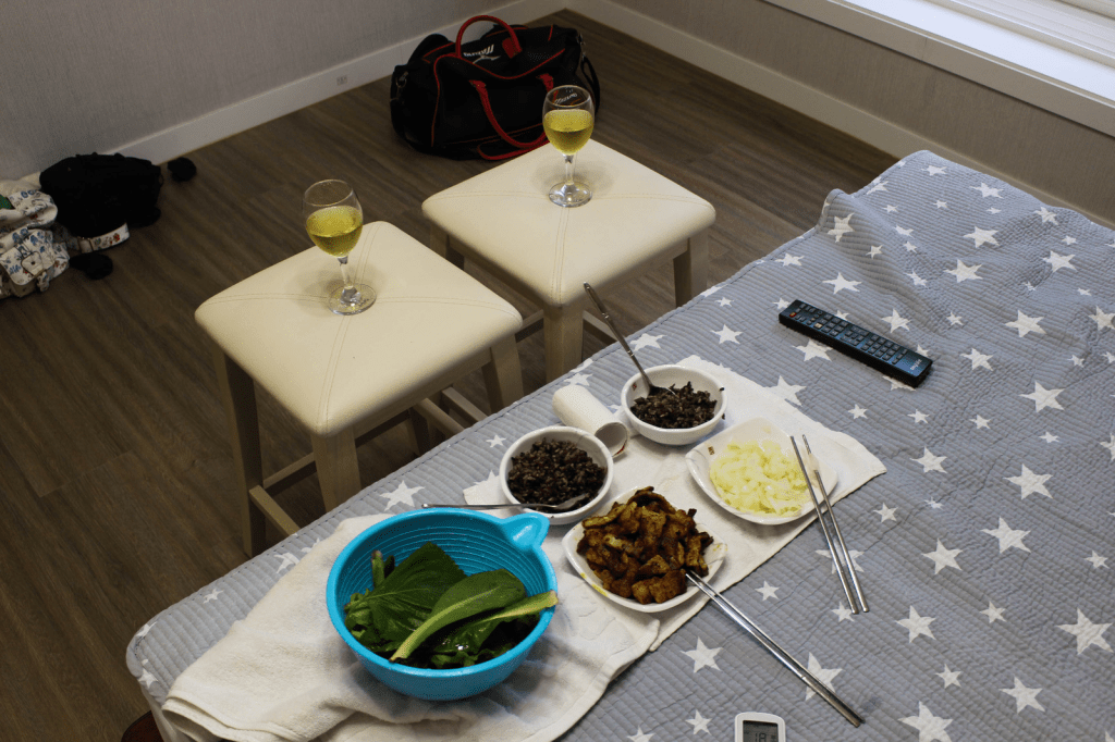 After playing around at the beach, we went back to our motel to make some food (there were only traditional Korean seafood/fish restaurants around which I sadly don’t like)! Earlier, we went to the supermarket and got some ingredients so we could make our own food instead. The place we stayed at was super nice, it even had a jacuzzi! And a big TV. So while eating our food, we laid in bed while watching random Korean TV-shows. Then at night, we took a stroll by the harbour which was right outside, and we almost stomped to death all those cute little crabs that ran across the road… You really had to look where you placed your next step! And I almost got eaten alive by all the mosquitos, even though I covered my body in clothes and mosquito repellent…