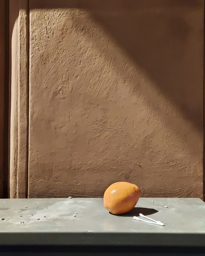 An orange and two cotton sticks.